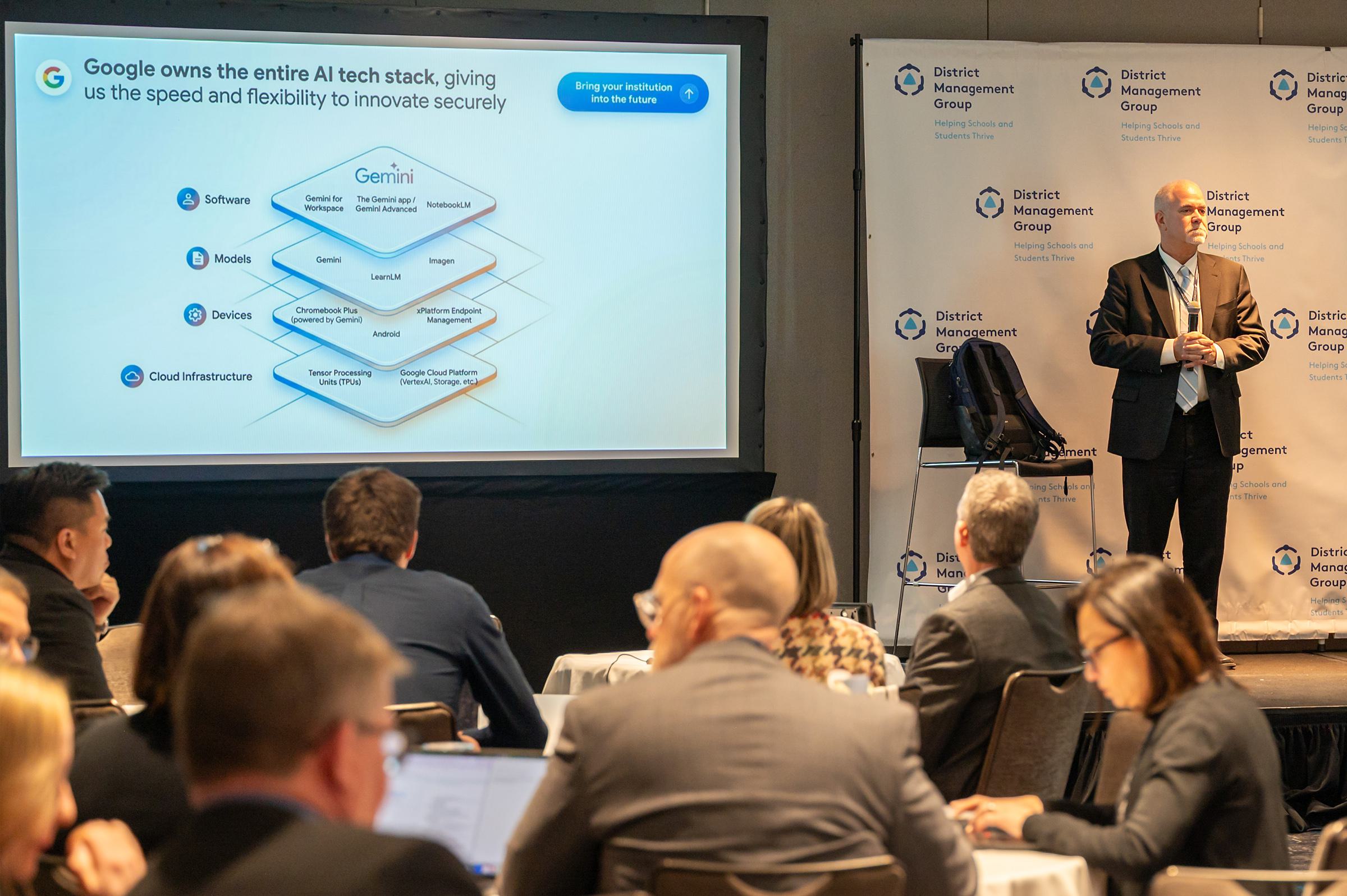 Our partners from Google for Education taught a hands-on workshop, co-led by fellow Superintendent Dr. Michael Lubelfeld from North Shore School District 112 (IL), to teach attendees how to build Gemini AI agents. Attendees explored practical use cases such as evaluating RFPs, board member training and knowledge sharing, and state reporting and testing analysis.