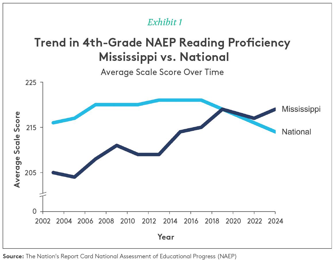 One early adopter of Science of Reading policies was Mississippi, which passed landmark legislation in 2013 requiring curriculum to be based on SoR. Student outcome data shows that this was the right move: on recent NAEP results, Mississippi shows a strong upward trajectory in fourth-grade reading, now surpassing the national average reading scale score for fourth-graders (Exhibit 1).2