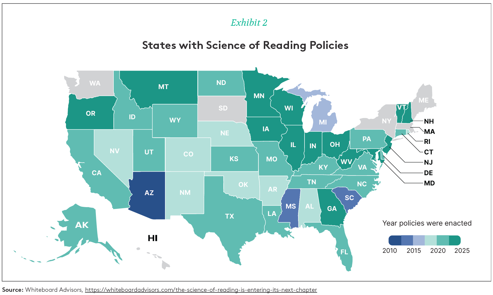 With Mississippi leading the way, now 40 states have policies mandating evidence-based literacy instruction. The movement has accelerated recently: in part spurred by the success of the podcast Sold a Story, 26 states adopted such policies in just the last three years (Exhibit 2).3
