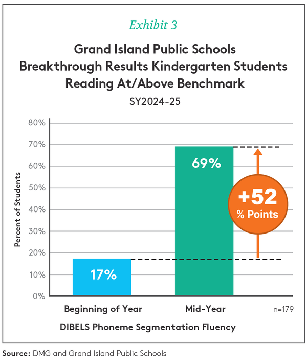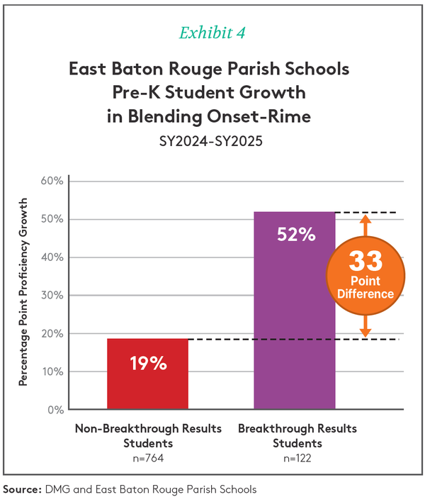 The Result: EBR's Breakthrough Results students showed remarkable growth, with a 52-point increase from midyear to end-of-year on a key phonemic awareness measure—2.7 times the growth of their peers (Exhibit 4).
