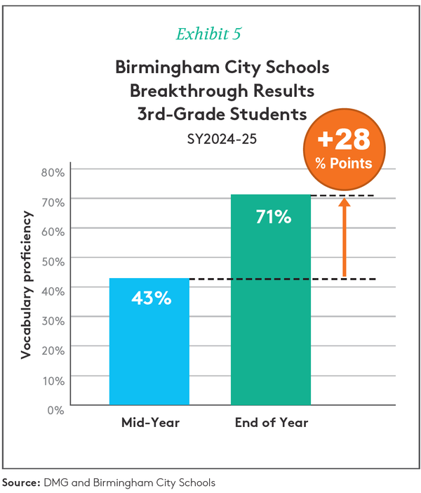 The Result: BTR students’ vocabulary proficiency increased by 28 points from mid-year to end-of-year (Exhibit 5), a gain seven times greater than that of their non-BTR peers. Importantly, Birmingham City Schools sustained the remarkable growth on the Alabama Comprehensive Assessment of Progress (ACAP) from the 2023-2024 school year, when they had implemented a fluency-focused Breakthrough Results program.